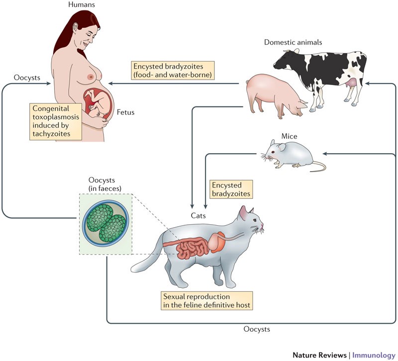 當貓咬到受感染的動物或攝入受感染的生肉,弓形蟲就能釋放卵囊到貓的消化道。弓形體病可經由卵囊, 透過糞便傳染給人類。